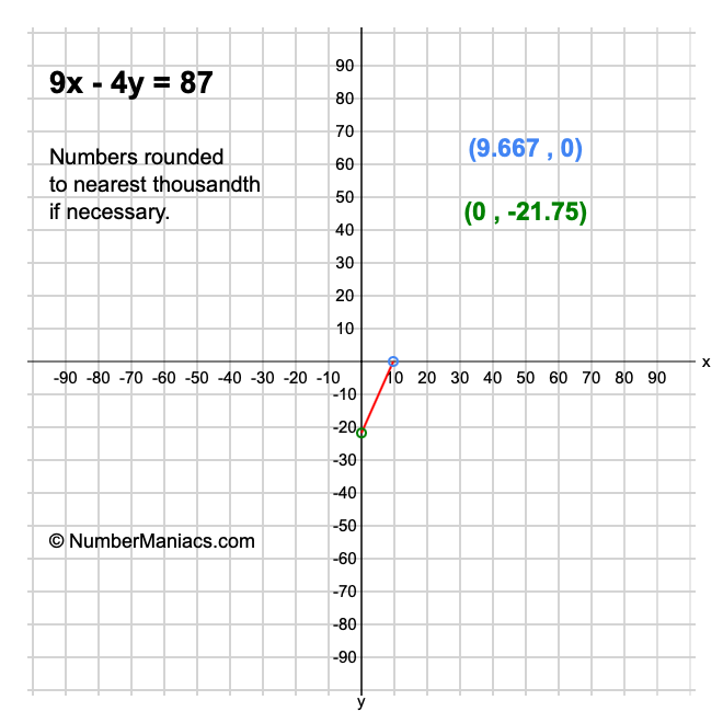 We will start by calculating and showing you the solution for the x-intercept and y-intercept of 9x - 4y = 87.