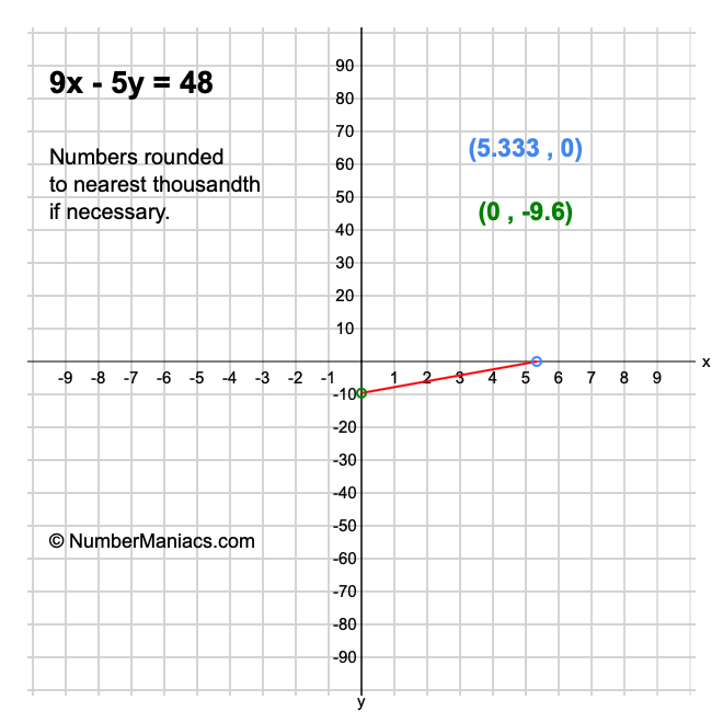 We will start by calculating and showing you the solution for the x-intercept and y-intercept of 9x - 5y = 48.