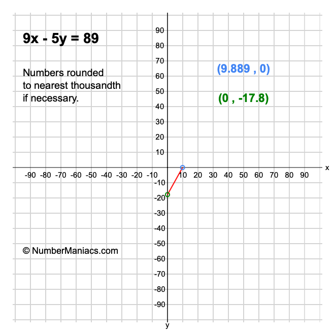 We will start by calculating and showing you the solution for the x-intercept and y-intercept of 9x - 5y = 89.