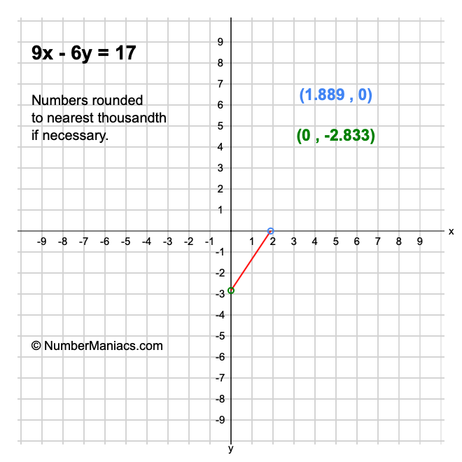 We will start by calculating and showing you the solution for the x-intercept and y-intercept of 9x - 6y = 17.