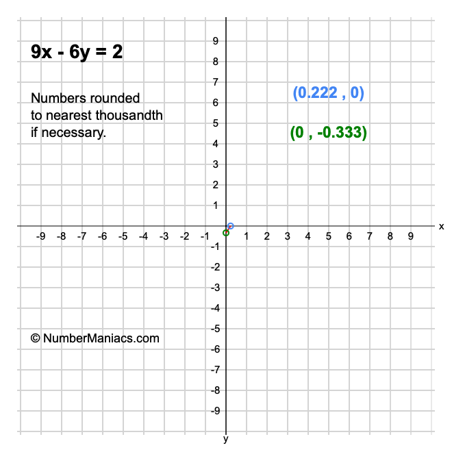 We will start by calculating and showing you the solution for the x-intercept and y-intercept of 9x - 6y = 2.