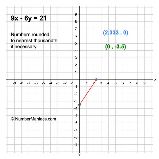 We will start by calculating and showing you the solution for the x-intercept and y-intercept of 9x - 6y = 21.