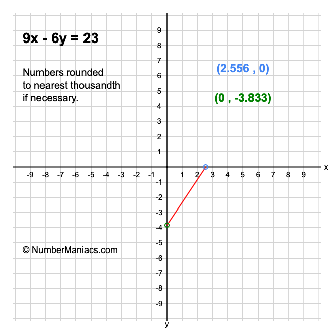 We will start by calculating and showing you the solution for the x-intercept and y-intercept of 9x - 6y = 23.