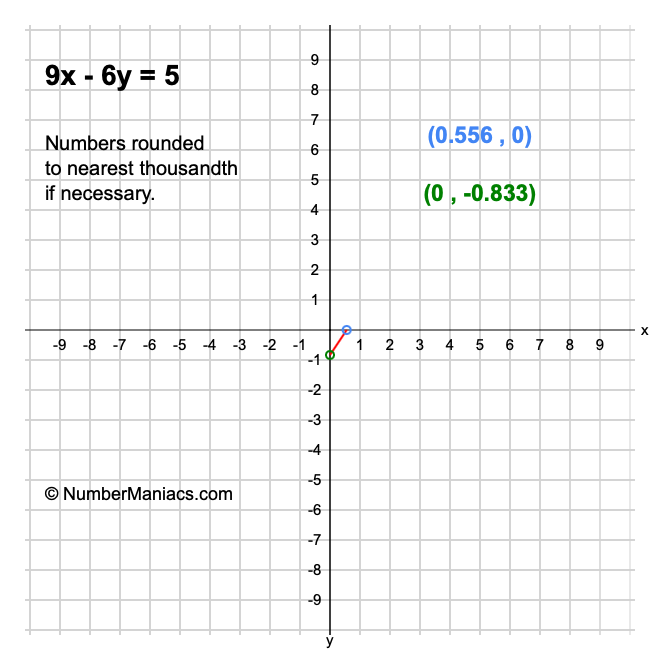We will start by calculating and showing you the solution for the x-intercept and y-intercept of 9x - 6y = 5.