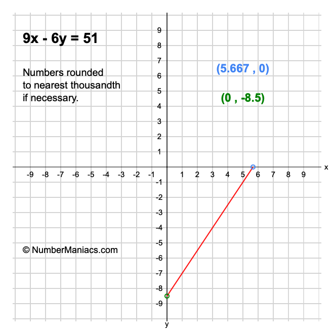 We will start by calculating and showing you the solution for the x-intercept and y-intercept of 9x - 6y = 51.
