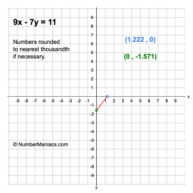We will start by calculating and showing you the solution for the x-intercept and y-intercept of 9x - 7y = 11.