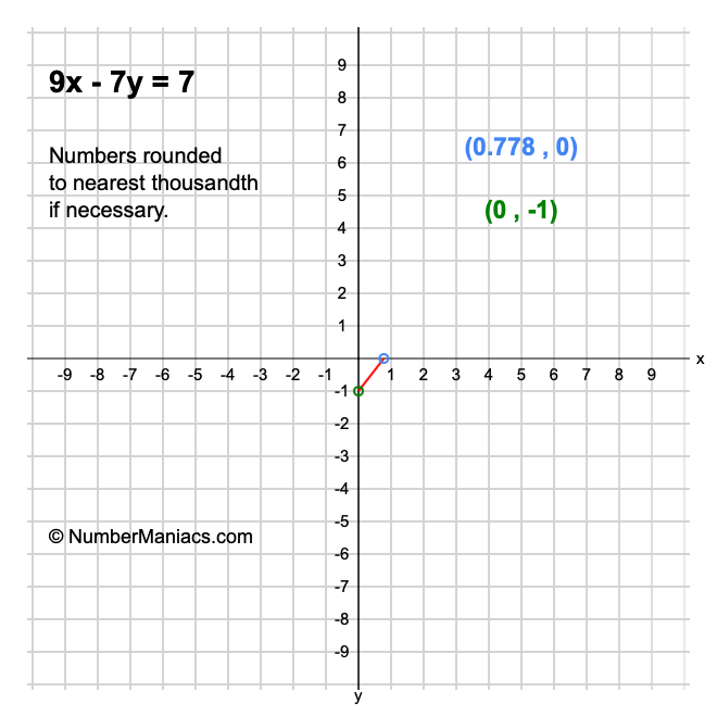 We will start by calculating and showing you the solution for the x-intercept and y-intercept of 9x - 7y = 7.
