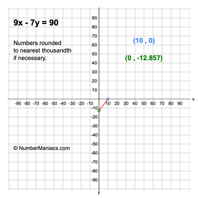 We will start by calculating and showing you the solution for the x-intercept and y-intercept of 9x - 7y = 90.