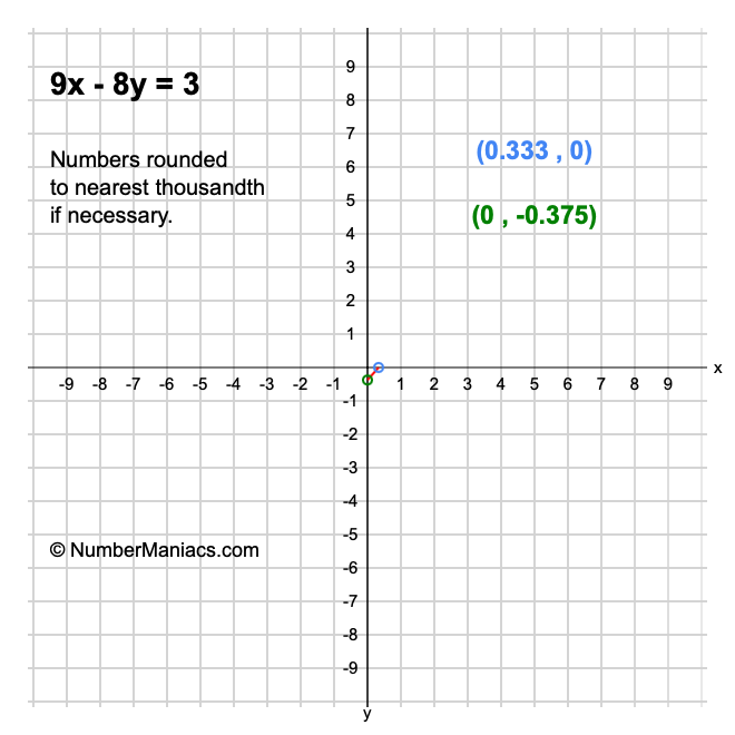 We will start by calculating and showing you the solution for the x-intercept and y-intercept of 9x - 8y = 3.