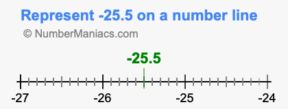 Representing negative 25.5 on the number line is a little more tricky. To locate -25.5, we start from 0 and go 25.5 to the left to locate -25.5 on the number line. Below is an illustration showing you where negative 25.5 is on a number line.
