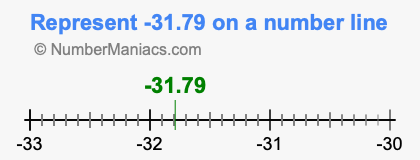 Representing negative 31.79 on the number line is a little more tricky. To locate -31.79, we start from 0 and go 31.79 to the left to locate -31.79 on the number line. Below is an illustration showing you where negative 31.79 is on a number line.