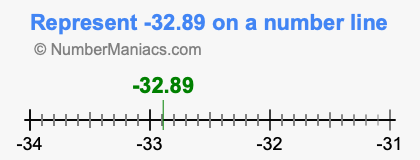Representing negative 32.89 on the number line is a little more tricky. To locate -32.89, we start from 0 and go 32.89 to the left to locate -32.89 on the number line. Below is an illustration showing you where negative 32.89 is on a number line.