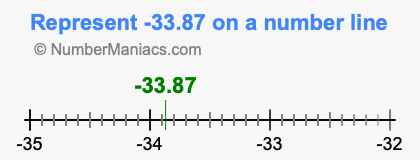 Representing negative 33.87 on the number line is a little more tricky. To locate -33.87, we start from 0 and go 33.87 to the left to locate -33.87 on the number line. Below is an illustration showing you where negative 33.87 is on a number line.