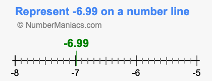 Representing negative 6.99 on the number line is a little more tricky. To locate -6.99, we start from 0 and go 6.99 to the left to locate -6.99 on the number line. Below is an illustration showing you where negative 6.99 is on a number line.