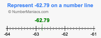 Representing negative 62.79 on the number line is a little more tricky. To locate -62.79, we start from 0 and go 62.79 to the left to locate -62.79 on the number line. Below is an illustration showing you where negative 62.79 is on a number line.
