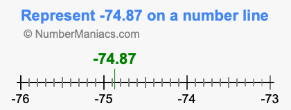 Representing negative 74.87 on the number line is a little more tricky. To locate -74.87, we start from 0 and go 74.87 to the left to locate -74.87 on the number line. Below is an illustration showing you where negative 74.87 is on a number line.