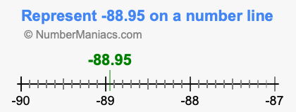 Representing negative 88.95 on the number line is a little more tricky. To locate -88.95, we start from 0 and go 88.95 to the left to locate -88.95 on the number line. Below is an illustration showing you where negative 88.95 is on a number line.