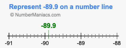 Representing negative 89.9 on the number line is a little more tricky. To locate -89.9, we start from 0 and go 89.9 to the left to locate -89.9 on the number line. Below is an illustration showing you where negative 89.9 is on a number line.