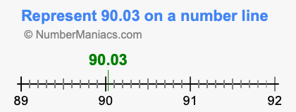 Below is an illustration showing you where 90.03 is located on a number line. It is located to the right of the 0 on the line, and as you can see, the numbers are increasing going from left to right. 90.03 is located 90.03 from 0.