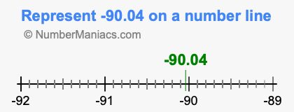 Representing negative 90.04 on the number line is a little more tricky. To locate -90.04, we start from 0 and go 90.04 to the left to locate -90.04 on the number line. Below is an illustration showing you where negative 90.04 is on a number line.