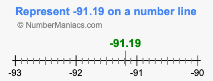Representing negative 91.19 on the number line is a little more tricky. To locate -91.19, we start from 0 and go 91.19 to the left to locate -91.19 on the number line. Below is an illustration showing you where negative 91.19 is on a number line.
