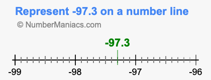 Representing negative 97.3 on the number line is a little more tricky. To locate -97.3, we start from 0 and go 97.3 to the left to locate -97.3 on the number line. Below is an illustration showing you where negative 97.3 is on a number line.
