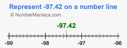 Representing negative 97.42 on the number line is a little more tricky. To locate -97.42, we start from 0 and go 97.42 to the left to locate -97.42 on the number line. Below is an illustration showing you where negative 97.42 is on a number line.