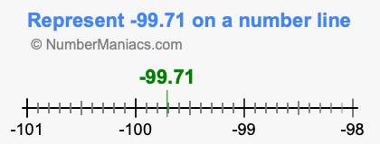 Representing negative 99.71 on the number line is a little more tricky. To locate -99.71, we start from 0 and go 99.71 to the left to locate -99.71 on the number line. Below is an illustration showing you where negative 99.71 is on a number line.